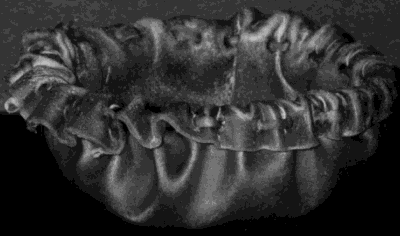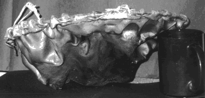 This may have been due to un-uniform thickness of the rawhide circle the pot was made from. Hide varies in thickness, and on the half hide this pot was made from it was impossible to find a circle of this area that was uniform in thickness throughout. Also thickness varies from hide to hide. Since I didn't specify a thickness grade when ordering, Buckskin Leather sent me the two best they had available. The ugly pot was made from the thicker of the two, and that, coupled with its greater vertical proportion, may have contributed to its greater uniformity in shrinkage.