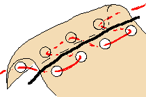 The next step was to make a dual set of holes around the circumference, as well as three extra sets of two for the support thongs at the points previously marked.